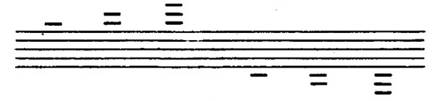 La demi pause (petit trait sur la troisième ligne) vaut 2 temps (même durée qu’une Blanche ou deux soupirs) : |